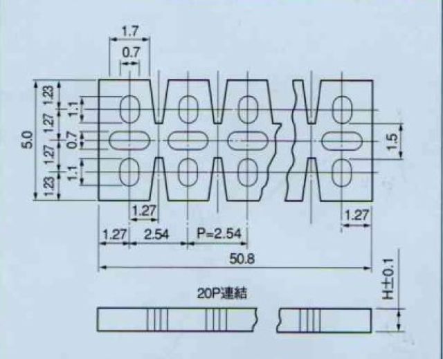 高さ(H寸法)2mmX幅5mmX長さ50.8mm(2.54mmピッチX20)3φ,5φのLEDにご使用できます。
